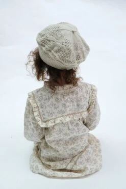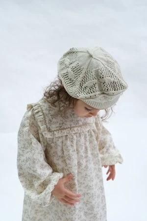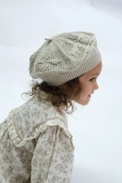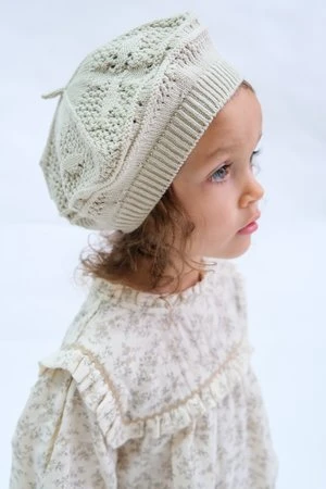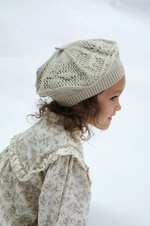 Classic style beret features romantic crochet style openwork knit with adorable flower detailing for romantic hearts.