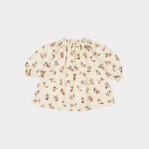 From Caramel London for Spring/Summer 2021. Relaxed fit baby girl dress in ivory and chocolate brown ditsy floral cotton. Delicate smocking along the neckline lends a beautiful drape to this puff sleeve dress. The cut is versatile and easy to wear.