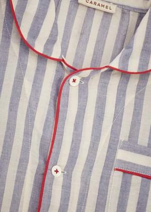 Indigo blue stripes and contrasting, yet classic, red piping make up this timeless style pyjama. With a pocket detail and drawstring to tie, this cosy cotton set ensures the utmost comfort for a perfect night’s sleep. 100% cotton.