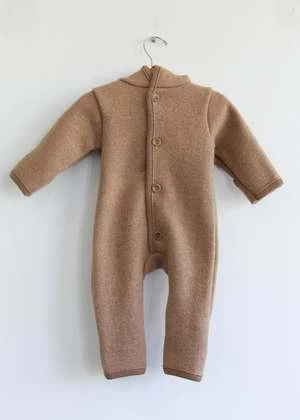 Made from felted wool, this overall buttons down the front. The sleeve- and bottom hems fold over to cover hands and feet.