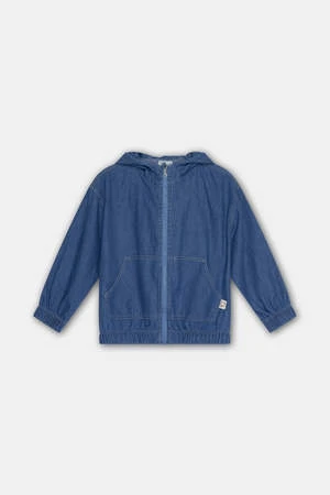 Hoodie light denim jacket with zipper, patch pockets and elastic wrists and waist.