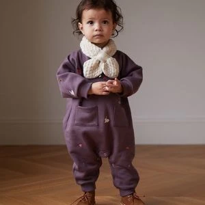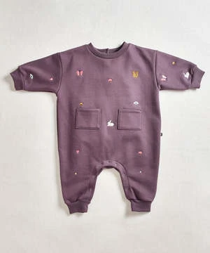 Features delicate embroidery, patch pockets and snap closures down legs and at neck.