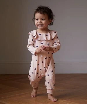 Extra soft pima cotton jumper in pink with ruffle collar and allover bunny print. Snap buttons on bottom.