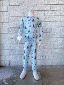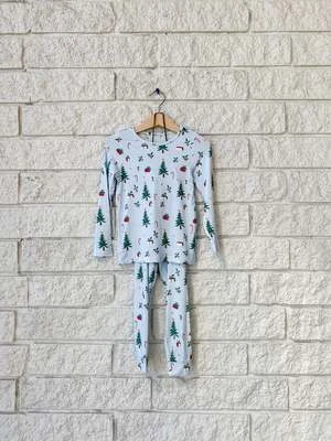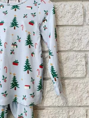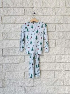 The Pink Chicken Kids Bamboo Pj Set in Holiday Cheer is an adorable holiday pajama set. Featuring Christmas tress along the bodice. These pajamas are lightweight and are perfect for the holiday season.