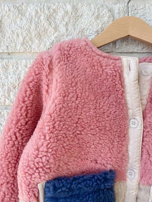 The Pink Chicken Ruth Jacket is a fun layer for your little one. It features a sherpa body with colorblocking in pink and ivory, as well as contrasting blue patch pockets. This jacket is a perfect piece for a warm running out the door top layer.