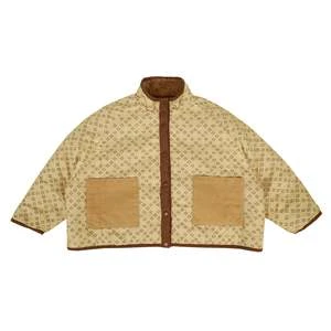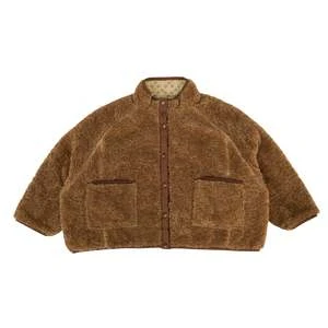 From Tambere for Autumn/Winter 2023. Chocolate brown faux shearling coat with matching patch pockets. Reverses to a printed beige side with caramel corduroy patch pockets.