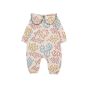 this lovely one piece is perfect for the transition from summer to winter. features elasticated cuffs, snap openings, buttons at the back neck and a collar with scallop detail finished in rich green stitching.