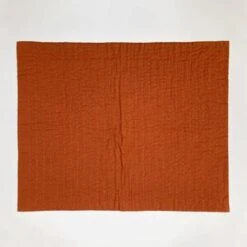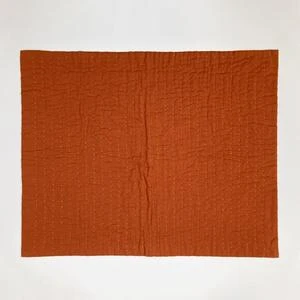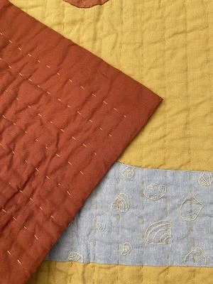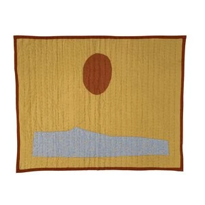 From Vanessa Chow. This hand sewn quilt features a burnt orange sun and abstract ocean wave with tiny embroidered shells. Set against a mustard yellow background. Back of blanket is solid burnt orange.